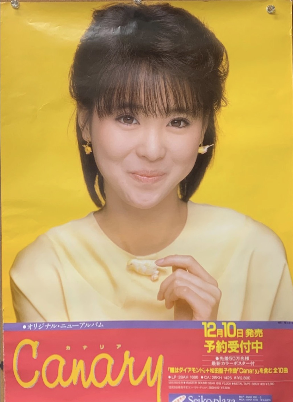 こちらは写真家 篠山紀信さんが撮影された黄色い1枚。少しはにかんで胸元のカナリアのブローチを触っています。販促お知らせ文が下部に見られます。